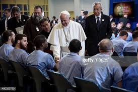 After the speech, Francis walked along the rows of inmates sitting in chairs, shaking hands, chatting, laying his hand on their foreheads and hugging a few. Here is a photograph to the right showing some of those interactions.